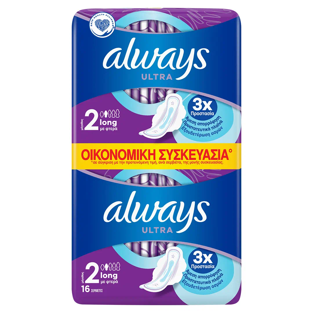Μην συμβιβάζεστε, απολαύστε 3πλή προστασία: Οι σερβιέτες Always Ultra Long (Μέγεθος 2) με φτερά αξιοποιούν την τελευταία λέξη της τεχνολογίας, δημιουργώντας μια πολυλειτουργική σερβιέτα με 3 λειτουργίες προστασίας. Το σύστημα InstantDry απορροφά τα υγρά σε δευτερόλεπτα και κρατά την υγρασία μακριά από την επιδερμίδα σας. Τεχνολογία LeakGuard που κλειδώνει τα υγρά και βοηθά στην πρόληψη των διαρροών. Είναι επίσης εξοπλισμένες με την τεχνολογία OdourLock που εξουδετερώνει τις οσμές, προσφέροντάς σας αίσθηση φρεσκάδας και καθαριότητας, σε όλη τη διάρκεια της περιόδου σας. Με την Always Ultra μπορείτε να αισθάνεστε αυτοπεποίθηση όλη την ημέρα. Για να μην συμβιβάζεστε ποτέ, απολαύστε 3πλή προστασία με την Always.