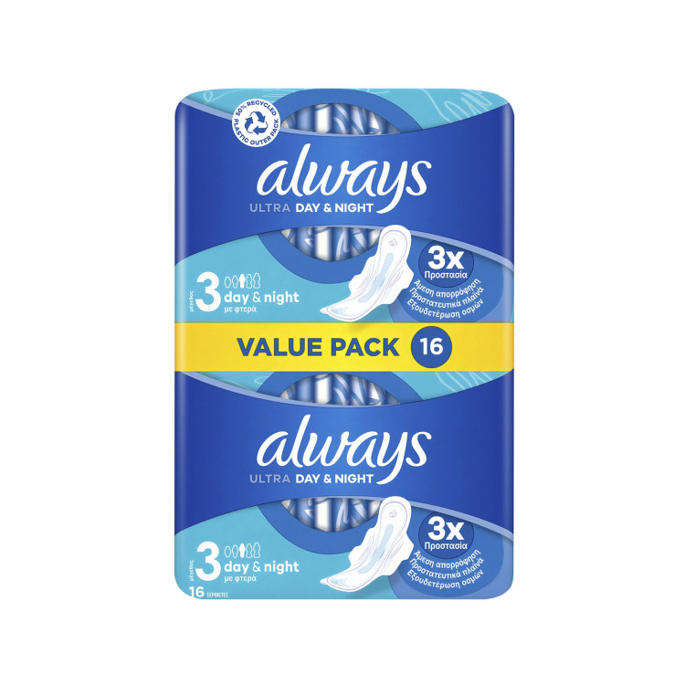 Μην συμβιβάζεστε, απολαύστε 3πλή προστασία: Οι σερβιέτες Always Ultra Day & Night (Μέγεθος 3) με φτερά αξιοποιούν την τελευταία λέξη της τεχνολογίας, δημιουργώντας μια πολυλειτουργική σερβιέτα με 3 λειτουργίες προστασίας για ασφάλεια κατά τη διάρκεια της μέρας και της νύχτας. Το σύστημα InstantDry απορροφά τα υγρά σε δευτερόλεπτα και κρατά την υγρασία μακριά από την επιδερμίδα σας. Τεχνολογία LeakGuard που κλειδώνει τα υγρά και βοηθά στην πρόληψη των διαρροών. Είναι επίσης εξοπλισμένες με την τεχνολογία OdourLock που εξουδετερώνει τις οσμές, προσφέροντάς σας αίσθηση φρεσκάδας και καθαριότητας, σε όλη τη διάρκεια της περιόδου σας. Με την Always Ultra μπορείτε να αισθάνεστε αυτοπεποίθηση όλη την ημέρα. Για να μην συμβιβάζεστε ποτέ, απολαύστε 3πλή προστασία με την Always.