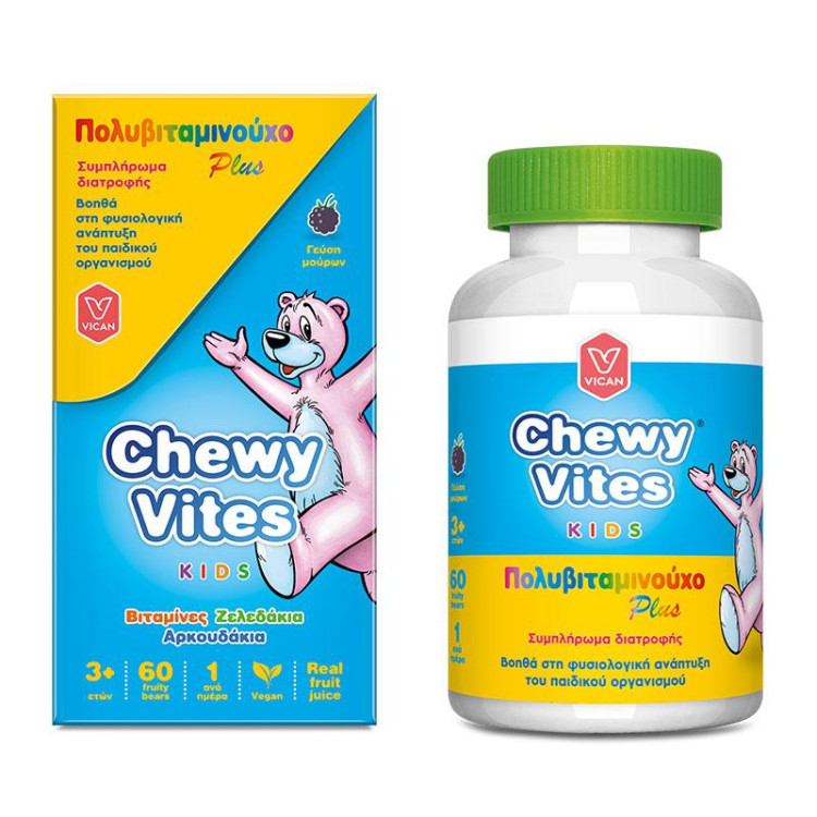 Chewy Vites® Kids Πολυβιταμινούχο Plus, μασώμενα φρουτώδη ζελεδάκια αρκουδάκια με υπέροχη γεύση μούρων που προσφέρουν όλες τις απαραίτητες βιταμίνες για τη σωστή ανάπτυξη του παιδικού οργανισμού.