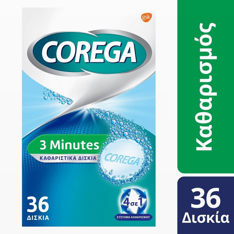 Οι τεχνητές οδοντοστοιχίες είναι περίπου 10 φορές πιο μαλακές από τα φυσικά σας δόντια και ο καθαρισμός τους με μια συνηθισμένη οδοντόκρεμα μπορεί να χαράξει την επιφάνειά τους δημιουργώντας σημεία στα οποία μπορούν να αναπτύσσονται βακτήρια. Τα καθαριστικά δισκία Corega 3 Minutes σας βοηθούν να καθαρίζετε την οδοντοστοιχία σας με καλύτερο τρόπο από ότι η οδοντόκρεμα*, καθώς δεν περιέχουν λειαντικές ουσίες, με αποτέλεσμα να καθαρίζουν χωρίς να χαράσσουν. Σε μόλις 3 λεπτά, καταπολεμούν το 99,9% των βακτηρίων που προκαλούν κακοσμία* και βοηθούν στην απομάκρυνση της πλάκας και των λεκέδων, όταν χρησιμοποιούνται σύμφωνα με τις οδηγίες χρήσης. Έτσι μπορείτε να διατηρήσετε την οδοντοστοιχία σας πιο καθαρή, πιο φρέσκια και πιο λαμπερή.