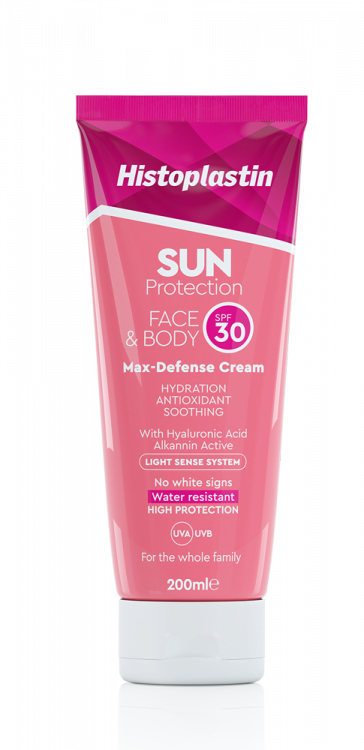 H Histoplastin SUN PROTECTION CREAM FACE & BODY SPF30 είναι αντηλιακή κρέμα προσώπου και σώματος μέγιστης προστασίας από τον ήλιο στην παραλία και τα σπορ. Βασίζεται στην τεχνολογία Alkannin Active Technology και προσφέρει τη νέα ολοκληρωμένη 360ᵒ αντηλιακή προστασία. Η ανάλαφρη υφή με Light Sense system απορροφάται άμεσα και δεν αφήνει λευκά ίχνη.