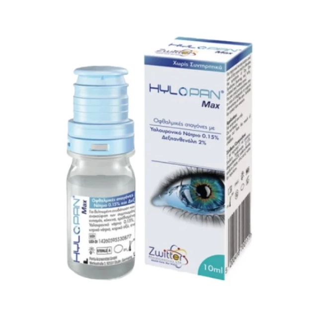 Θρέψη, ενυδάτωση, καταπράυνση και προστασία: Με σύνθεση από μοναδικό συνδυασμό υαλουρονικού νατρίου (sodium hyaluronate) και δεξπανθενόλης (dexpanthenol), οι οφθαλμικές σταγόνες Hylopan Max Eye Drops της Zwitter Pharma αποτελεί κατάλληλο προϊόν για τους χρήστες φακών επαφής και για όλες τις ηλικίες (συχνή ή μακροχρόνια χρήση).