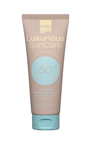 Intermed Luxurious Sun Care Silk Cover Natural With Hyaluronic Acid SPF50 , Υψηλή αντιηλιακή προστασία & ανάπλαση προσώπου με ήπια καλυπτικότητα 75 ml