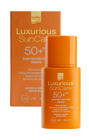 Intermed Luxurious SunCare SUN PROTECTION DROPS SPF50+ , Λεπτόρευστο αντηλιακό γαλάκτωμα προσώπου με ενισχυμένο συνδυασμό φωτοσταθερών φίλτρων 30 ml