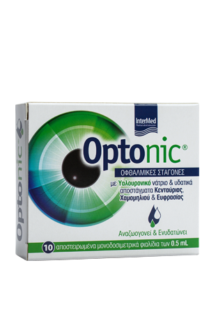 Τα Optonic με κενταύρια, χαμομήλι & υαλουρονικό οξύ (ως υαλουρονικό νάτριο) 0,1%, είναι στείρες οφθαλμικές σταγόνες με υαλουρονικό οξύ, για την αποτελεσματική και παρατεταμένη ενυδάτωση, λίπανση και ανακούφιση των ταλαιπωρημένων λόγω της ξηρότητας οφθαλμών (ξηροφθαλμία).