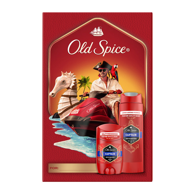 Απελευθερώστε απίστευτη φρεσκάδα όλο το 24ωρο* με τα σετ δώρου Old Spice! Αναζητάτε το τέλειο δώρο για τον μοντέρνο πειρατή που κινείται στη ζωή με αυτοπεποίθηση και ένα θρυλικό άρωμα; Μην ψάχνετε άλλο! Το σετ δώρου περιλαμβάνει το ανδρικό αποσμητικό στικ και αφρόλουτρο Captain, όλα όμορφα συσκευασμένα σε κουτί με σχέδιο Captain. Τίποτα δεν μπορεί να πάει στραβά με το ποιοτικό άρωμα Old Spice Captain: το άρωμα των άγριων κυμάτων του ωκεανού, του σανταλόξυλου και του πικάντικου περγαμόντο θα σας μεταμορφώσει στον ατρόμητο καπετάνιο της φρεσκάδας. Πώς δεν είναι ακόμα αυτό το σετ δώρου Old Spice στο καλάθι σας; (*με χρήση αφρόλουτρου και αποσμητικού).
