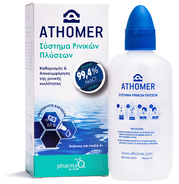 Το Σύστημα Ρινικών Πλύσεων ATHOMER αποτελεί μια φυσική θεραπευτική μέθοδο για τον καθαρισμό της ρινικής κοιλότητας. Η συσκευή είναι ειδικά σχεδιασμένη για πλύσεις του ρινικού βλεννογόνου. Κατά τη χρήση της, εκπλύνεται όλη η ρινική κοιλότητα και ο ασθενής έχει πλήρη έλεγχο της πίεσης – ροής με αποτέλεσμα να προσαρμόζεται ανάλογα με τις ανάγκες και τις ιδιαιτερότητες του καθενός.