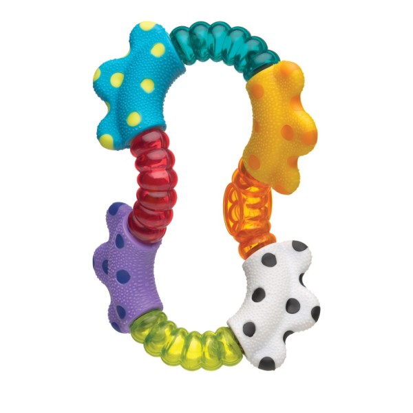 Παιχνίδι κουδουνίστρα που αλλάζει σχήμα στρίβοντάς το παράγοντας ταυτόχρονα ήχο. Με υλικά διαφορετικής υφής για ανάπτυξη της αφής. Κατάλληλο για μωρά άνω των 3 μηνών.
