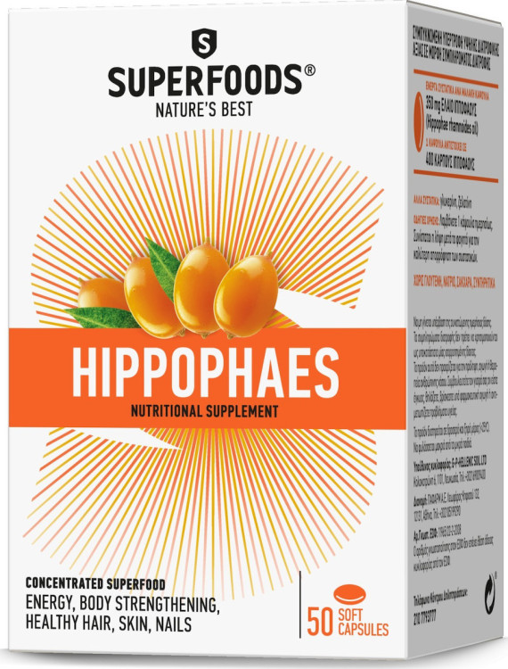 Το Ιπποφαές από την Ελληνική Εταιρεία Superfoods είναι ένα φυτοθεραπευτικό συμπλήρωμα διατροφής σε μαλακές κάψουλες με κύριο συστατικό το Ιπποφαές. Η κάθε κάψουλα αποδίδει 350mg ελαίου Ιπποφαούς που αντιστοιχεί σε 400 καρπούς του φυτού. Το SUPERFOODS ΙΠΠΟΦΑΕΣ, παραλαμβάνεται με την προηγμένη μέθοδο επεξεργασίας «Υπερκρίσιμη εκχύλίση» που επιτυγχάνει τη μέγιστη προστασία των πολύτιμων συστατικών του καρπού μεταφέροντας τα αυτούσια σε κάθε κάψουλα.