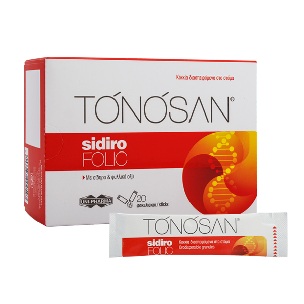 Το TONOSAN SidiroFOLIC αποτελεί ένα συμπλήρωμα διατροφής, στην πρακτική μορφή των διασπειρόμενων στο στόμα κοκκίων σε φακελίσκο, για την κάλυψη των καθημερινών απαιτήσεων σε σίδηρο και φολικό οξύ, χωρίς να απαιτείται η χρήση νερού. Ο σίδηρος συνεισφέρει στο φυσιολογικό σχηματισμό των ερυθρών αιμοσφαιρίων & της αιμοσφαιρίνης καθώς και στη μεταφορά οξυγόνου στους ιστούς. Το φολικό οξύ συμβάλλει στον σχηματισμό των συστατικών του αίματος. Παράλληλα, ο σίδηρος & το φολικό οξύ συμβάλλουν στην ενίσχυση της λειτουργίας του ανοσοποιητικού συστήματος και στη μείωση της κούρασης και της κόπωσης. Η σύνθεση είναι εμπλουτισμένη με βιταμίνες Β6, Β12, C & D.